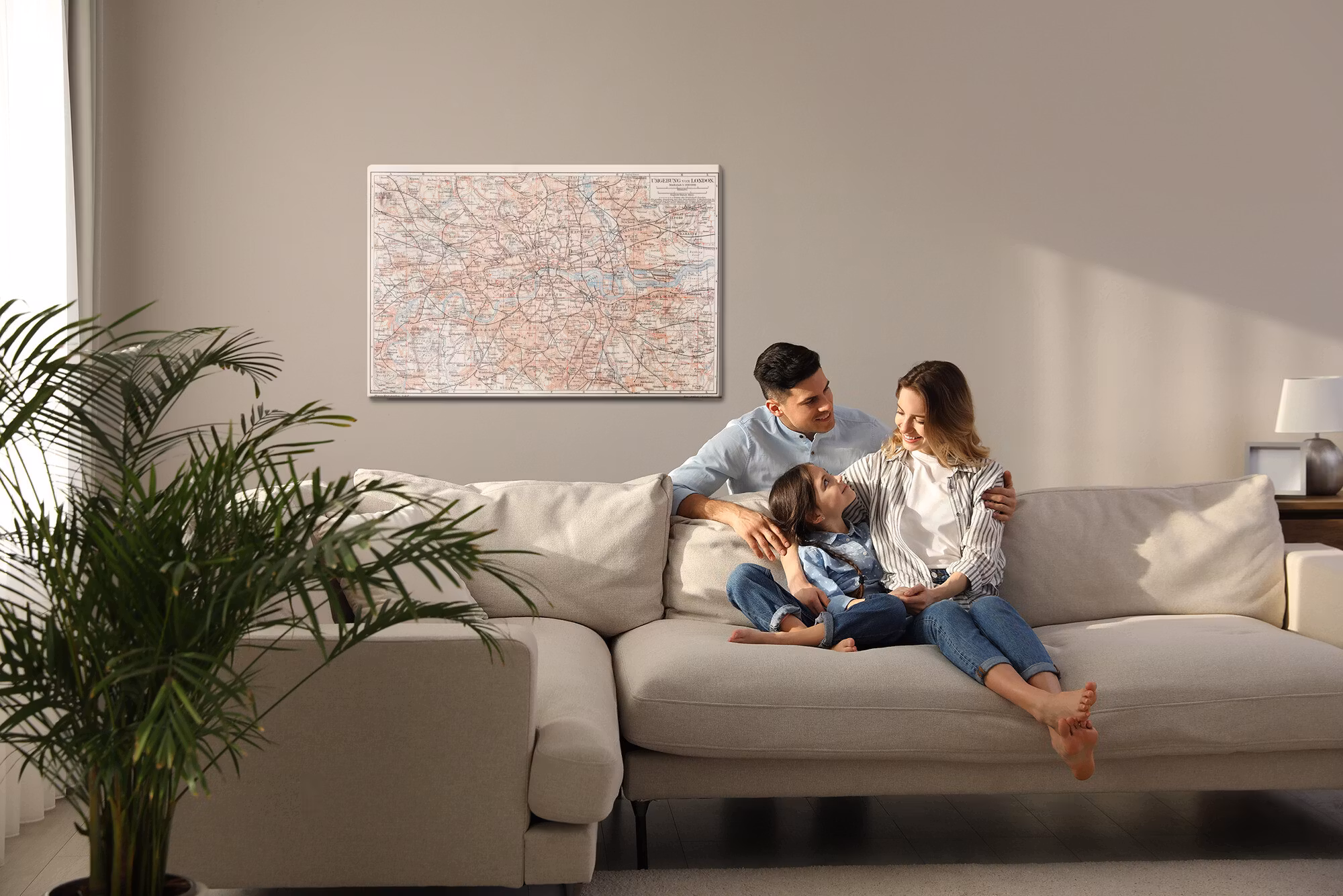 Motivet trycks runt hela ramen för ett stilrent och komplett utseende – ingen ytterram behövs. Tavlan levereras färdig att hängas upp; fäst bara ramen på en eller två skruvar. Kanttrycket gör att Map of london and the surrounding area framträder lika vackert från sidan som framifrån, och helhetsintrycket förblir lugnt och balanserat.